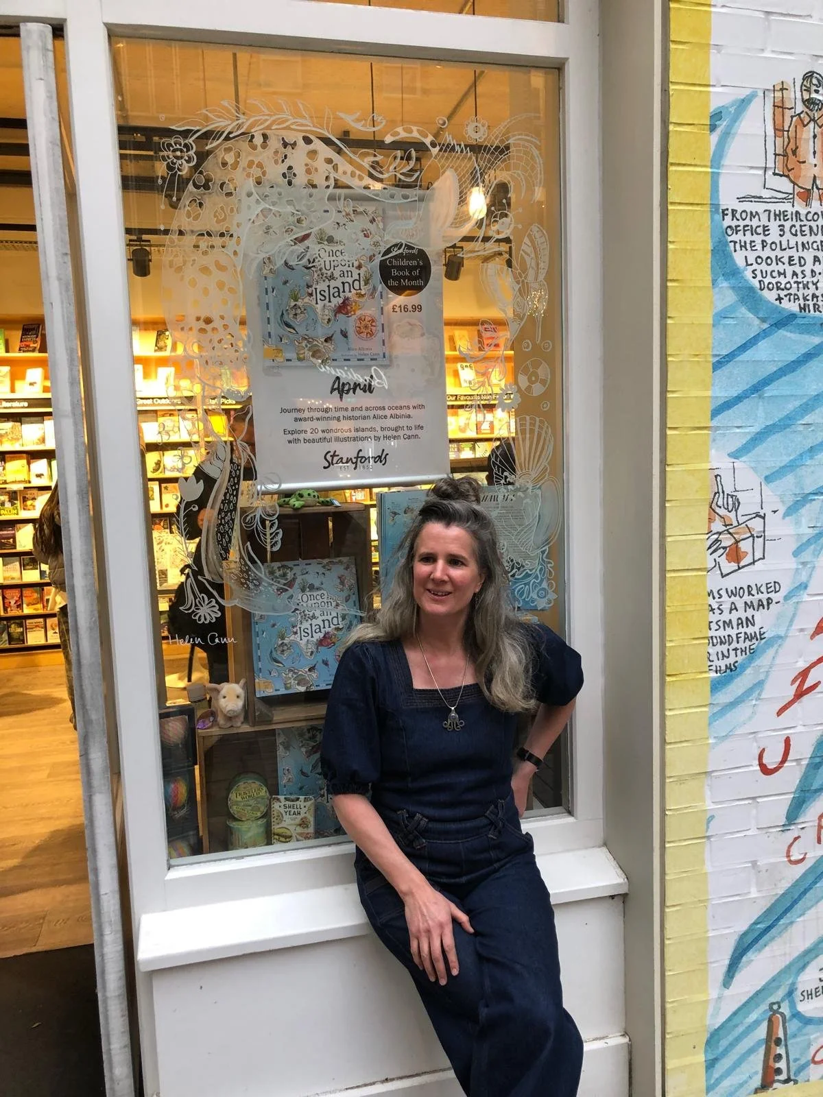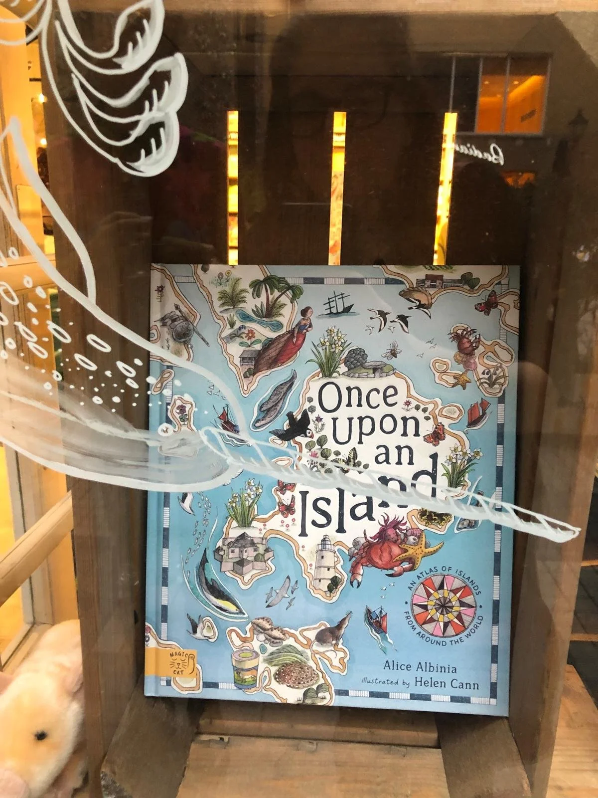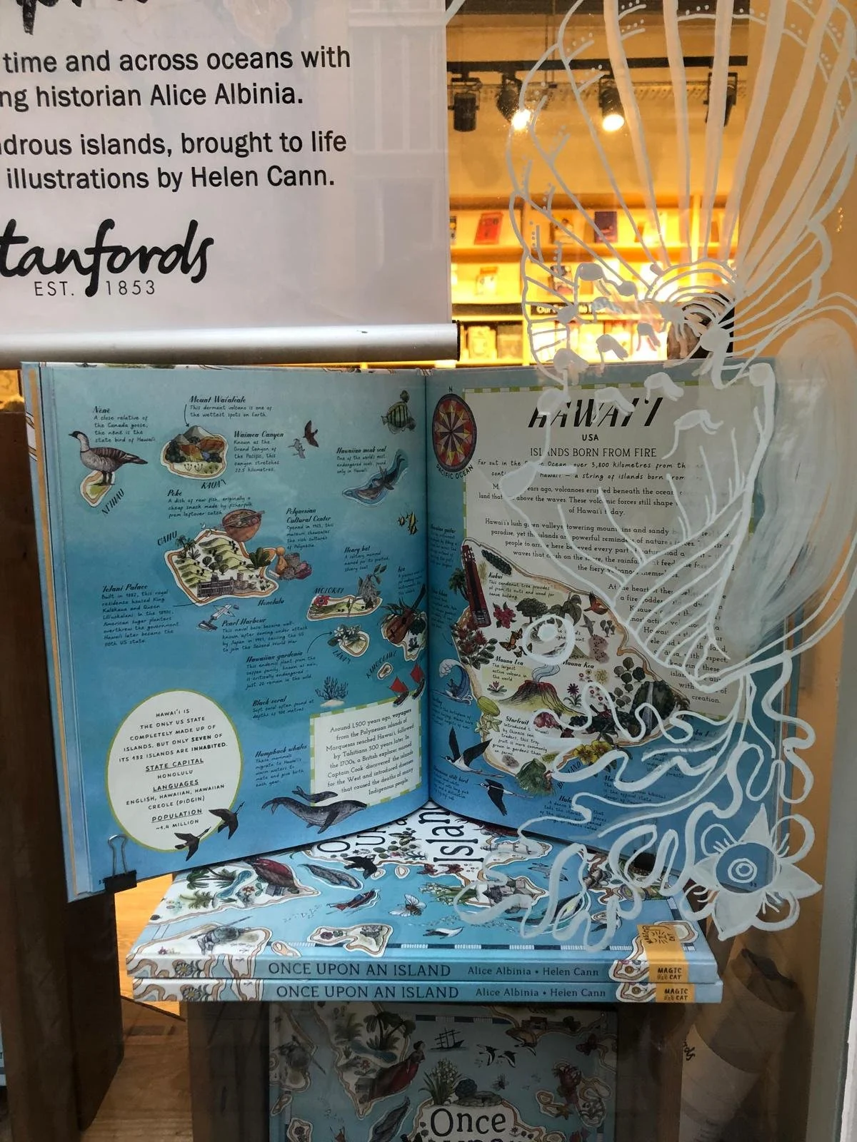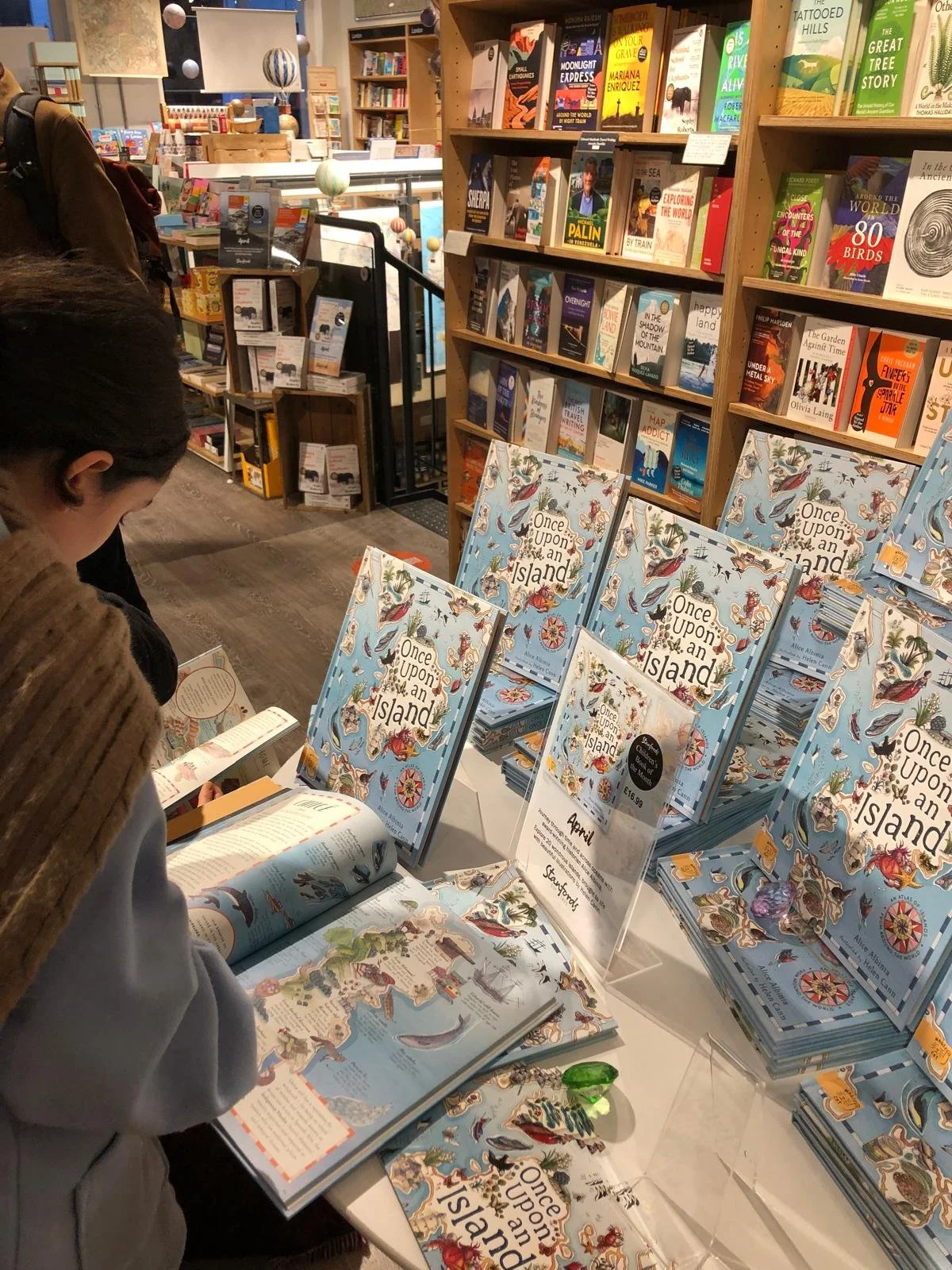 It was wonderful to be able to celebrate the publication by children’s publisher Magic Cat of Alice Albinia’s ONCE UPON AN ISLAND, illustrated by Helen Cann. The party was held at Stanfords bookshop in Covent Garden. Stanfords have made it their Children’s Book of the Month, and Helen Cann had illustrated the window for the display.