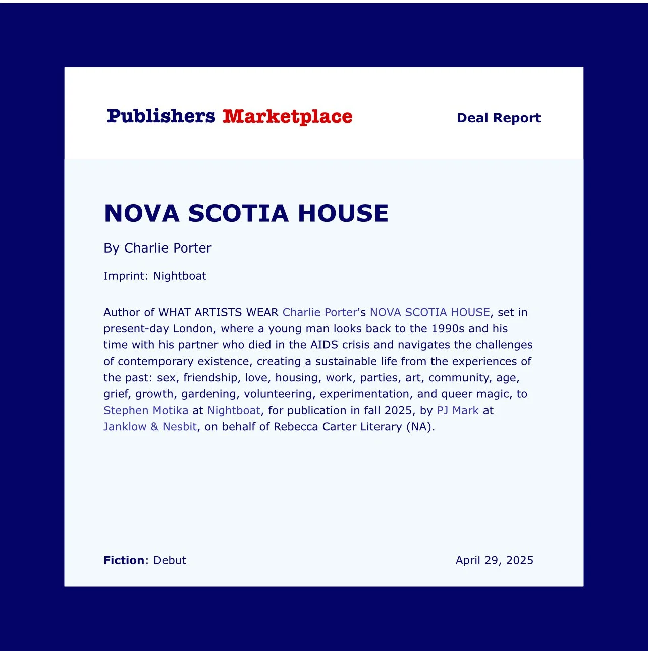 It has been incredible to see the powerful effect that Charlie Porter’s debut novel Nova Scotia House has been having on people since it was published last month.
