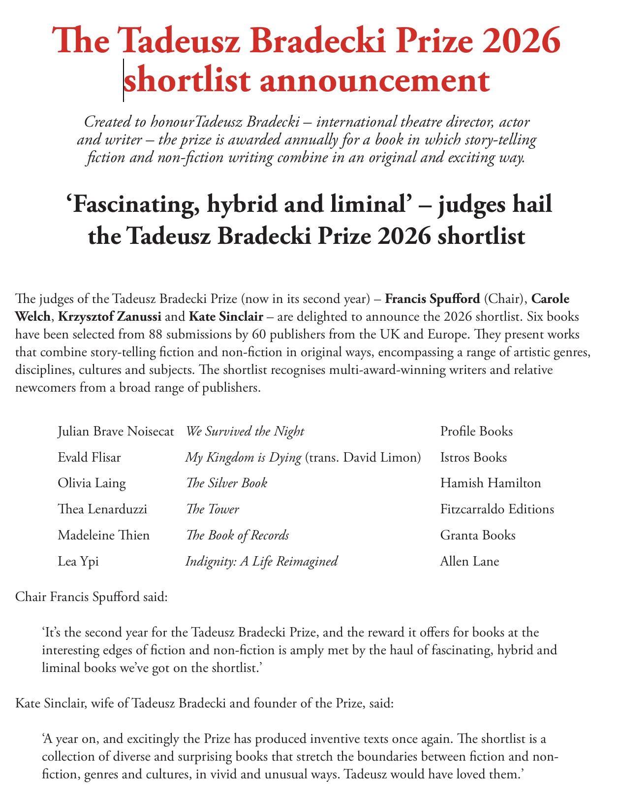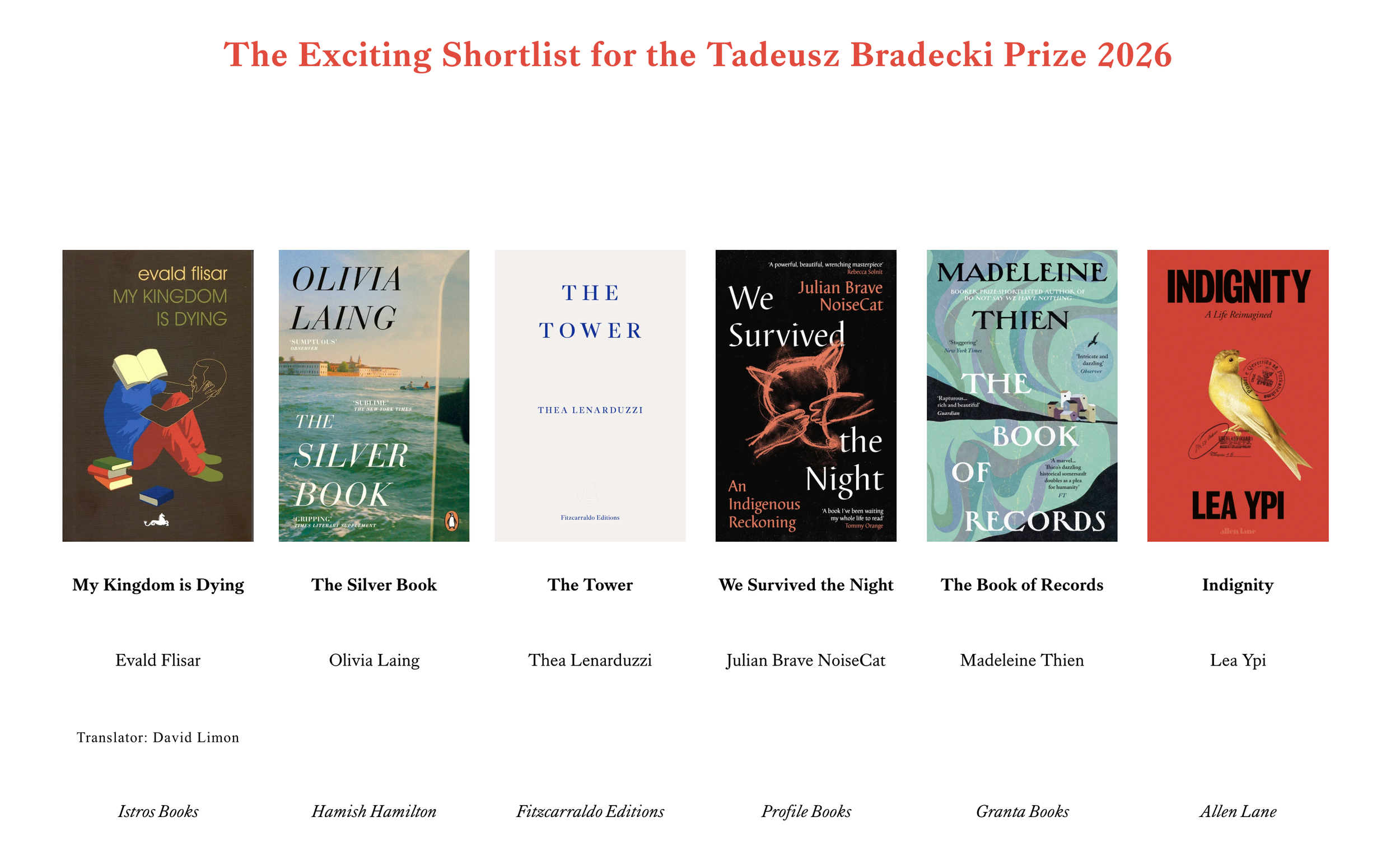 This is such a great prize for Olivia Laing’s novel The Silver Bookto be shortlisted for. The Tadeusz Bradecki Prize was established in the theatre director, actor and writer’s name to recognise story-telling fiction and non-fiction writing that combines in an original and exciting way. The winner is announced on 20 May.